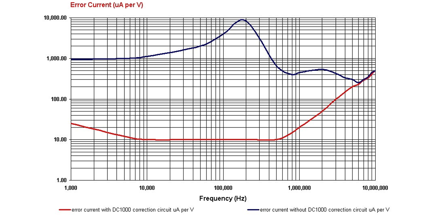 The DC1000A also features proprietary AC correction circuitry that reduces these AC error currents by up to 100×, immediately improving measurement accuracy.
