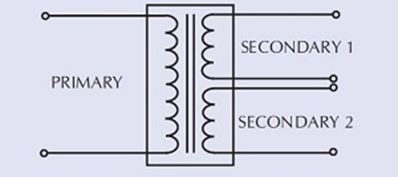 An ideal transformer with one primary winding and two secondary windings can be represented as shown below: